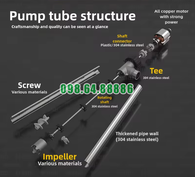 Máy sử dụng ống bơm và trục quay inox 304, kết hợp với cánh bơm inox SUS304 nguyên khối. Cấu tạo này giúp máy có độ bền cao, chịu được môi trường làm việc có độ bám dính lớn như resin đặc, đồng thời giảm nguy cơ xuống cấp nhanh khi vận hành thường xuyên.