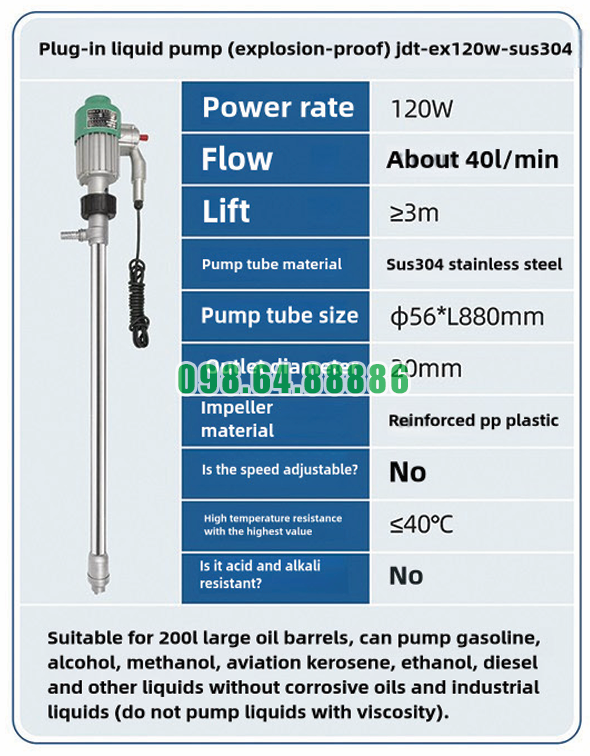 Thiết kế thân inox 304 cao cấp của Bơm chất lỏng cắm điện chống cháy nổ JDT-EX120W-SUS304 được ứng dụng rộng rãi trong các lĩnh vực như kho nhiên liệu, nhà máy sản xuất, xưởng cơ khí và các khu công nghiệp. Thiết bị đáp ứng tốt yêu cầu về độ bền, an toàn và hiệu suất làm việc.