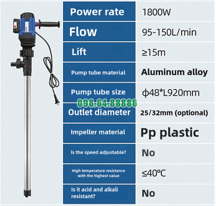 Nhờ khả năng chịu nhiệt độ môi trường tốt, bơm điện thùng phuy cao cấp JDT-1800W-L92 có thể sử dụng linh hoạt trong nhiều điều kiện khác nhau như nhà xưởng kín, kho hóa chất, khu vực chiết rót ngoài trời hoặc môi trường có nhiệt độ cao kéo dài.