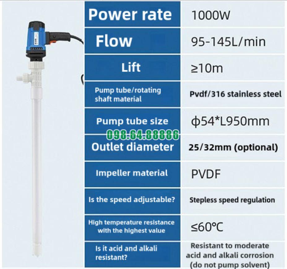 Một trong những ưu điểm nổi bật khiến bơm cắm điện thùng phuy model JDT-1000W-PVDF được nhiều doanh nghiệp lựa chọn là thiết kế có kích thước nhỏ gọn, tối ưu cho việc di chuyển và thao tác trong môi trường công nghiệp.