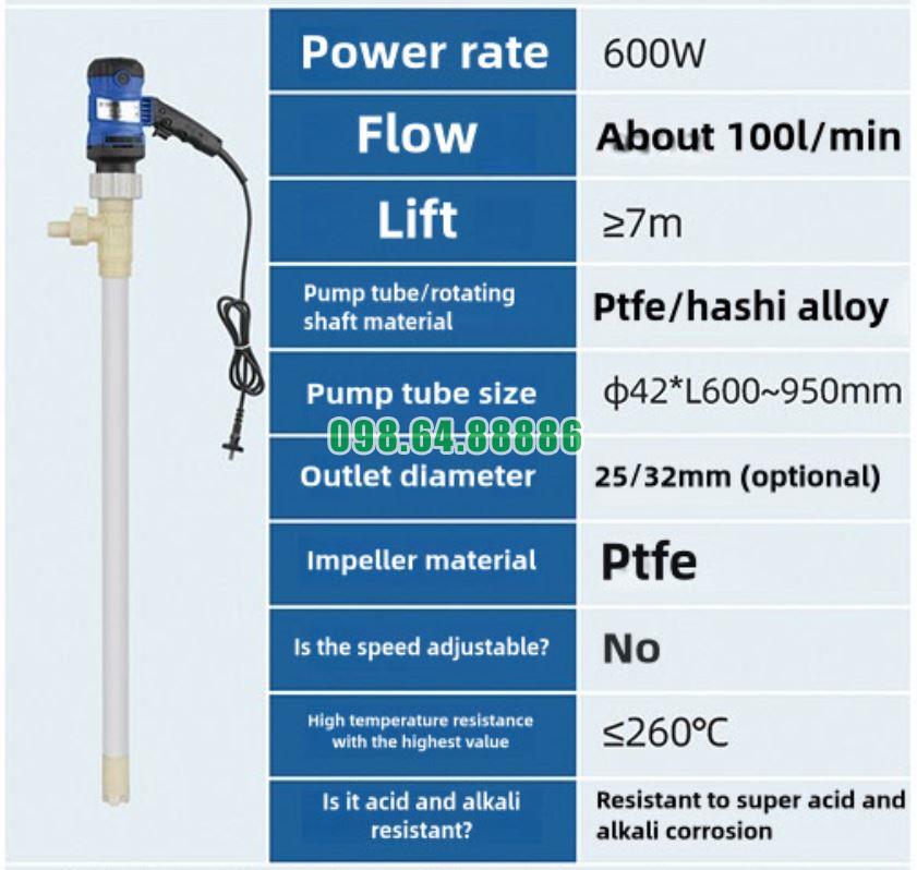 Bơm thùng phuy công nghiệp JDT-600W-PTFE, lưu lượng 100 lít/phút