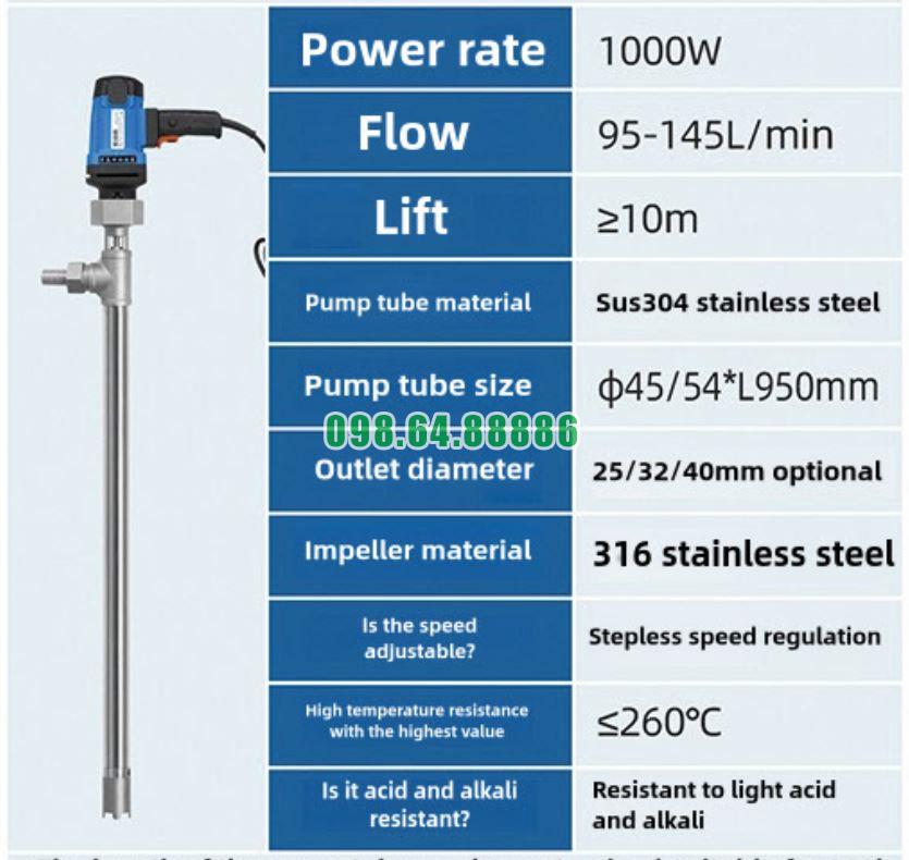 Máy bơm thùng phuy inox SUS304/316 JDT-1000W-G260 là thiết bị hiệu suất cao, bền bỉ và an toàn, đặc biệt thích hợp cho ngành công nghiệp hóa chất, sơn, xử lý nước và xi mạ. Dù chi phí đầu tư ban đầu cao và trọng lượng nặng, nhưng tuổi thọ dài, khả năng chống ăn mòn tuyệt vời và độ ổn định cao khiến đây là giải pháp kinh tế – kỹ thuật tối ưu trong dài hạn.